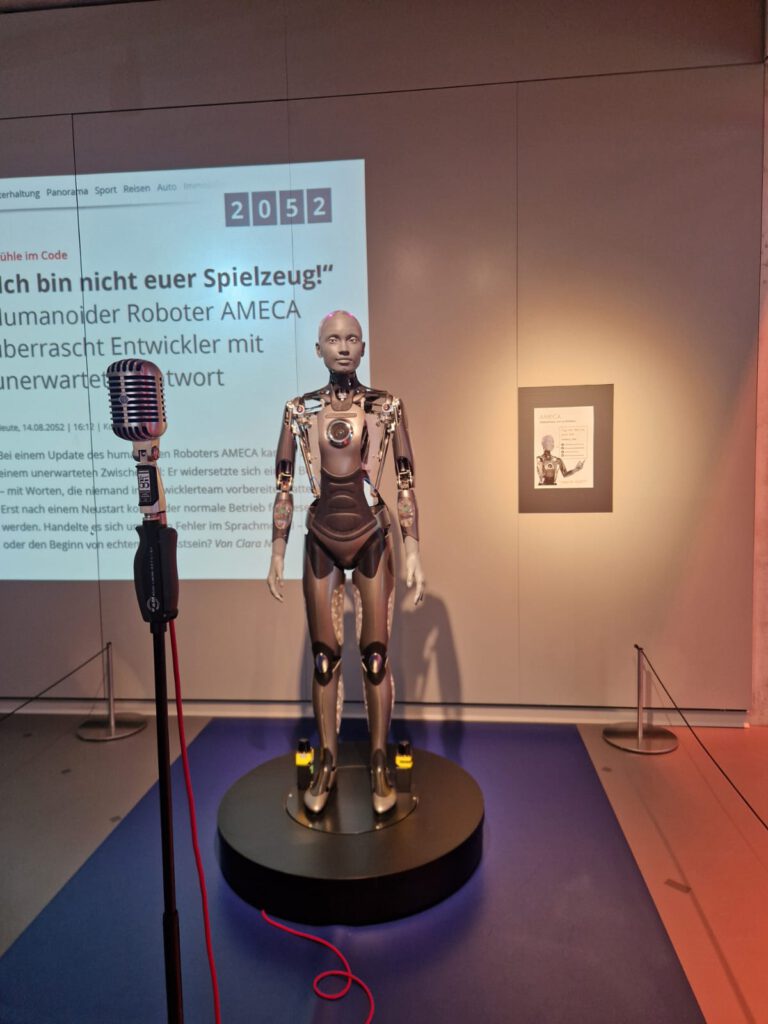Am 3.12.2025 besuchte die Klasse W11b der Staatlichen FOS Nürnberg II im Rahmen eines fpA-Nachmittages das Zukunftsmuseum in Nürnberg. Dort bekamen wir einen Überblick über Zukunftstechnologien, Ideen, Probleme und den bisherigen Fortschritt. Die erste Ausstellung drehte sich rund um KI-Roboter und humanoide Roboter. Der erste Roboter war ein humanoid aussehender, von der Robotik-Firma „Engineered Arts“ zusammen mit der „ChatGPT“ KI hergestellter Roboter. Dieser kann in vielen unterschiedlichen Sprachen Antworten, bestimmte Mimik, sowie auch kleine Gesten ausführen.