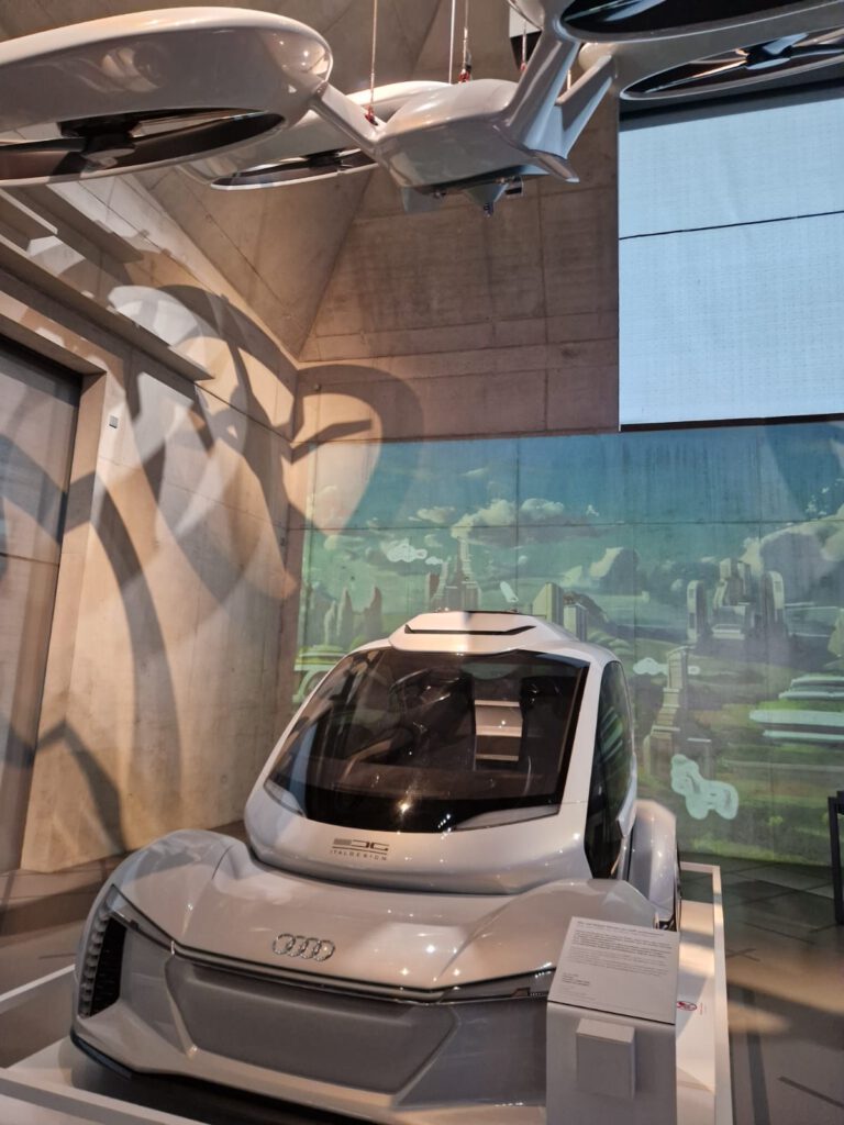 Im Mobilitätsbereich präsentierte das Museum Zukunftskonzepte wie selbstfahrende Taxi-Drohnen. Autos ohne jegliche Steuerungsmöglichkeit wie Pedale oder Lenkrad, mit einer großen Drohne, die am Dach angekoppelt werden kann. Diese Fahrzeuge sollen nicht mehr im Privatbesitz stehen, sondern wie Taxis gerufen werden können. Dies soll Staus und Platzprobleme minimieren, ist jedoch nur eine Idee und Entwurf und nicht tatsächlich umsetzbar, zumindest nicht in absehbarer Zukunft.